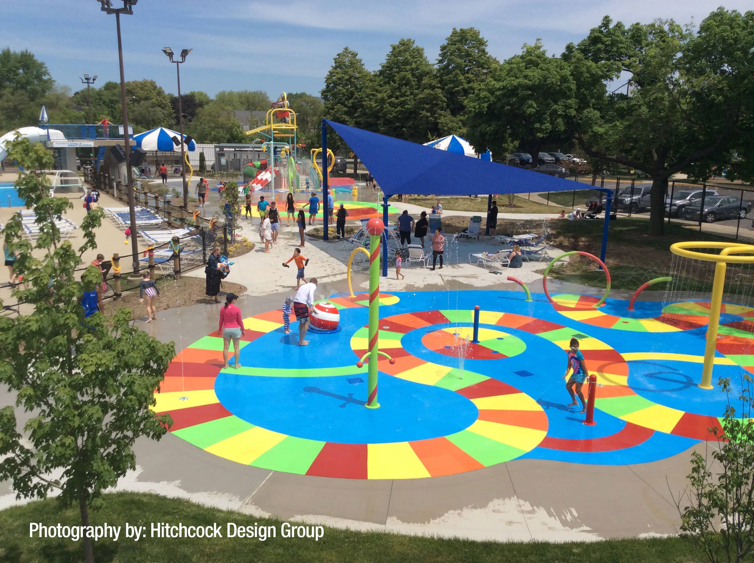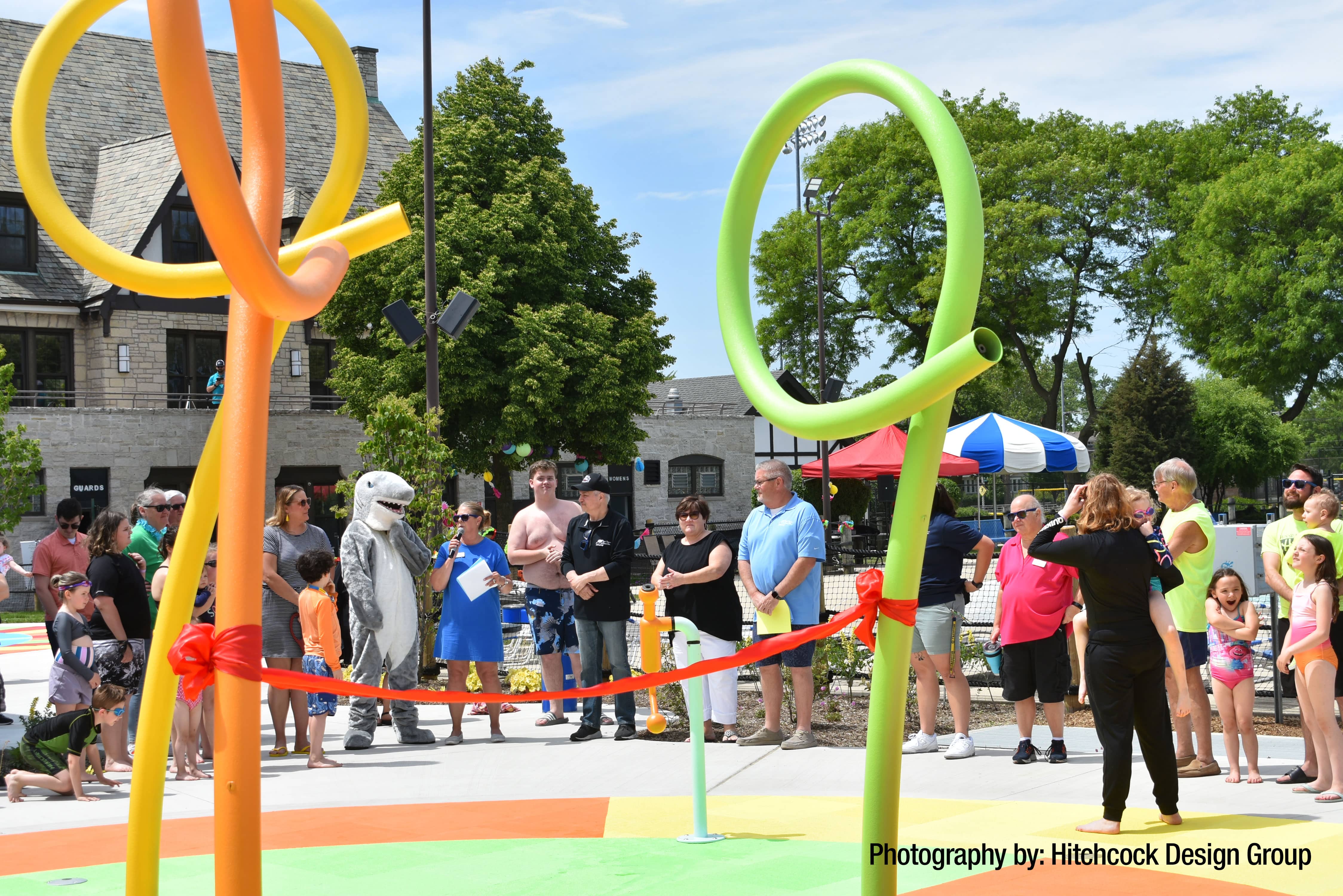 Working in collaboration with Hitchcock Design Group, the Parks District of Forest Park has created a splash pad design inspired by the local candy manufacturer, Ferrara Candy Company. Known for their delicious non-chocolate confections like Pixie Sticks and Black Forest Gummy Bears, Ferrara Candy Company served as the muse for this one-of-a-kind water play area. Additionally, the city pays tribute to its beloved mascot, Bruce the Shark, with a specially designed Gummy Shark Fun Form.