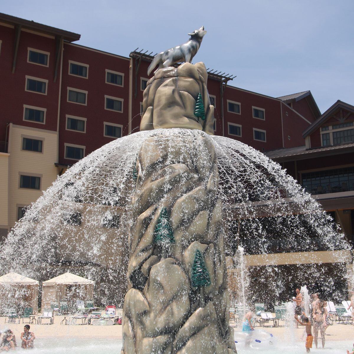 Great Wolf Mountain, the signature water feature for their resorts is a unique piece that produces a deluge of water when the wolf howels.