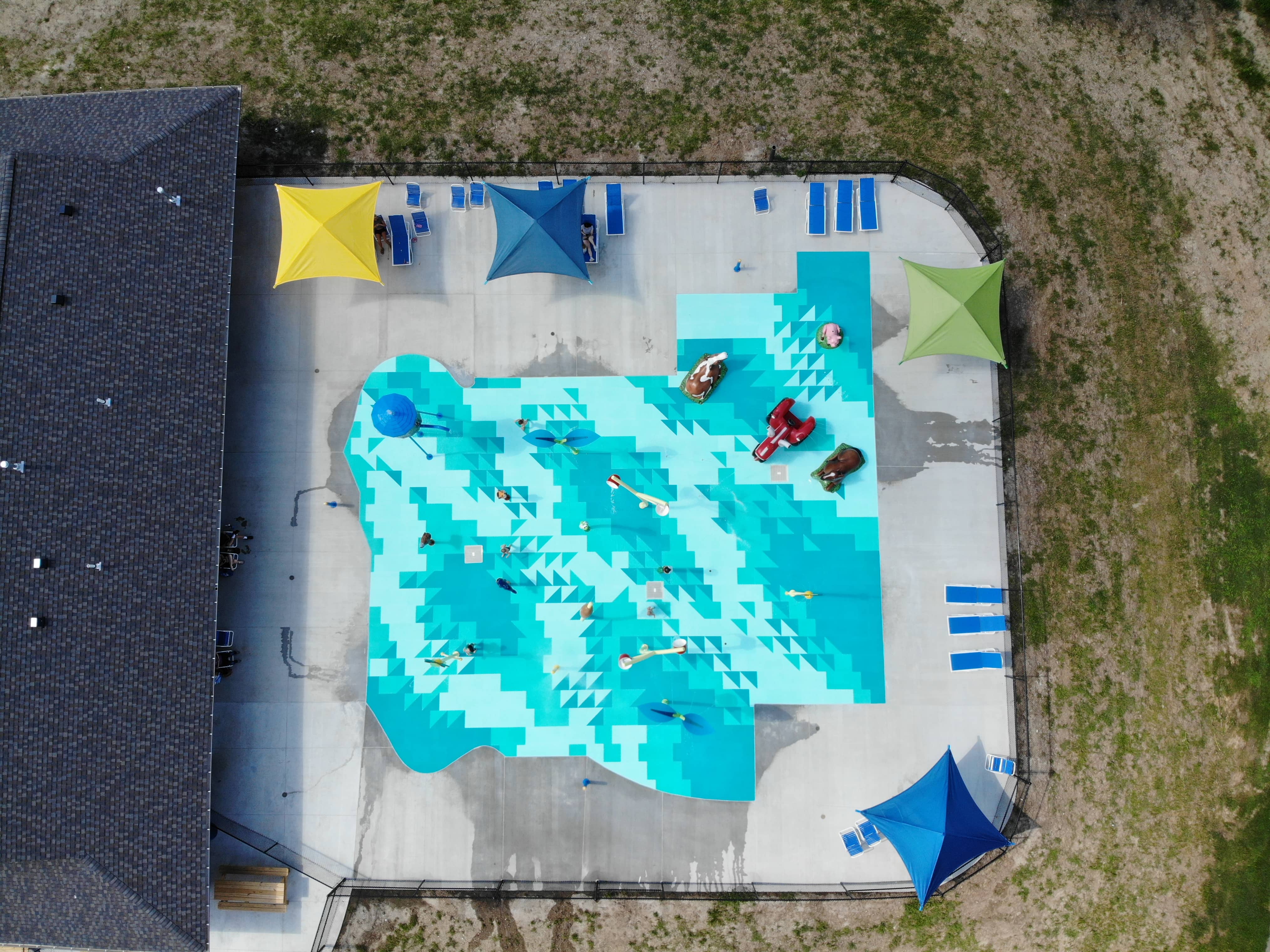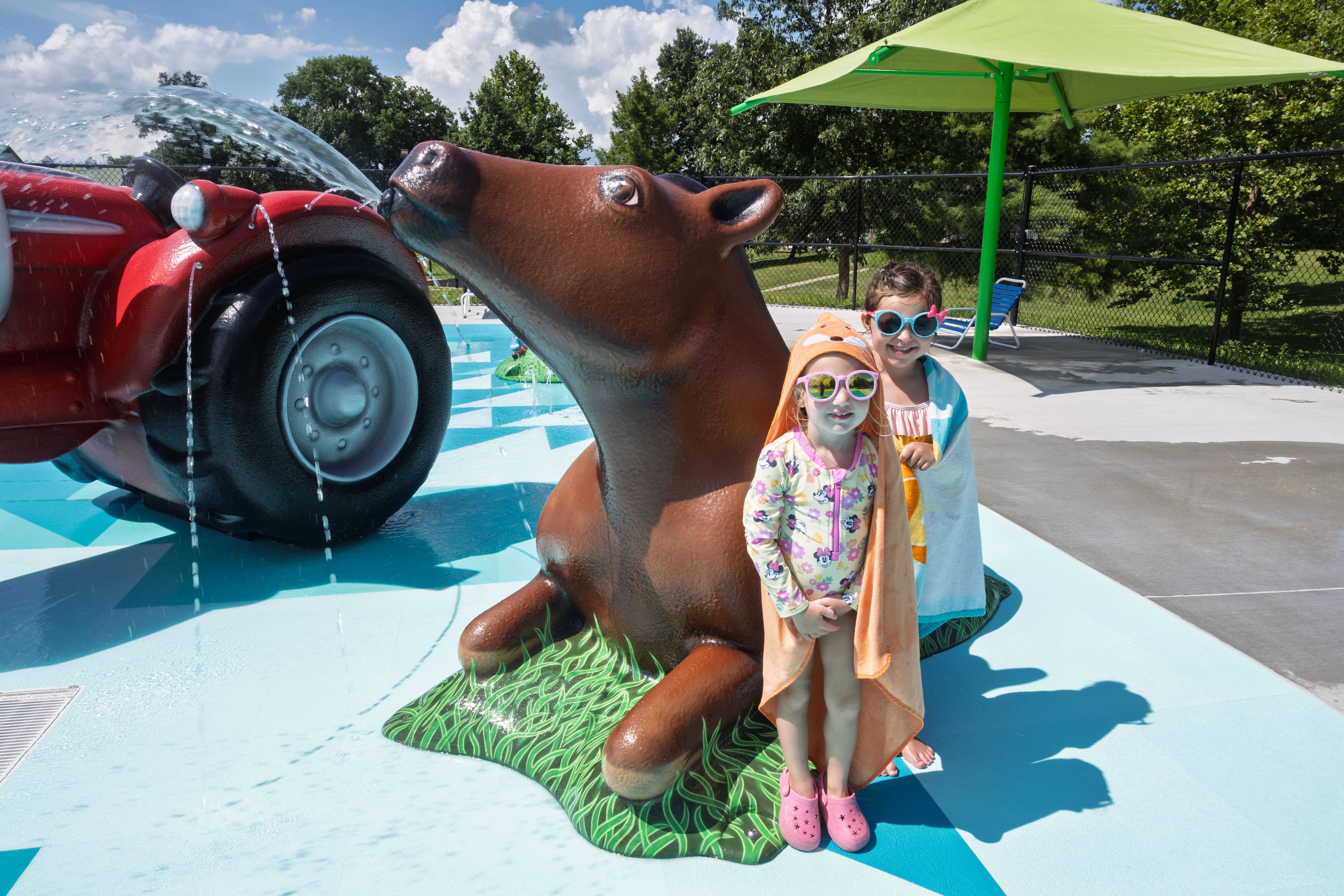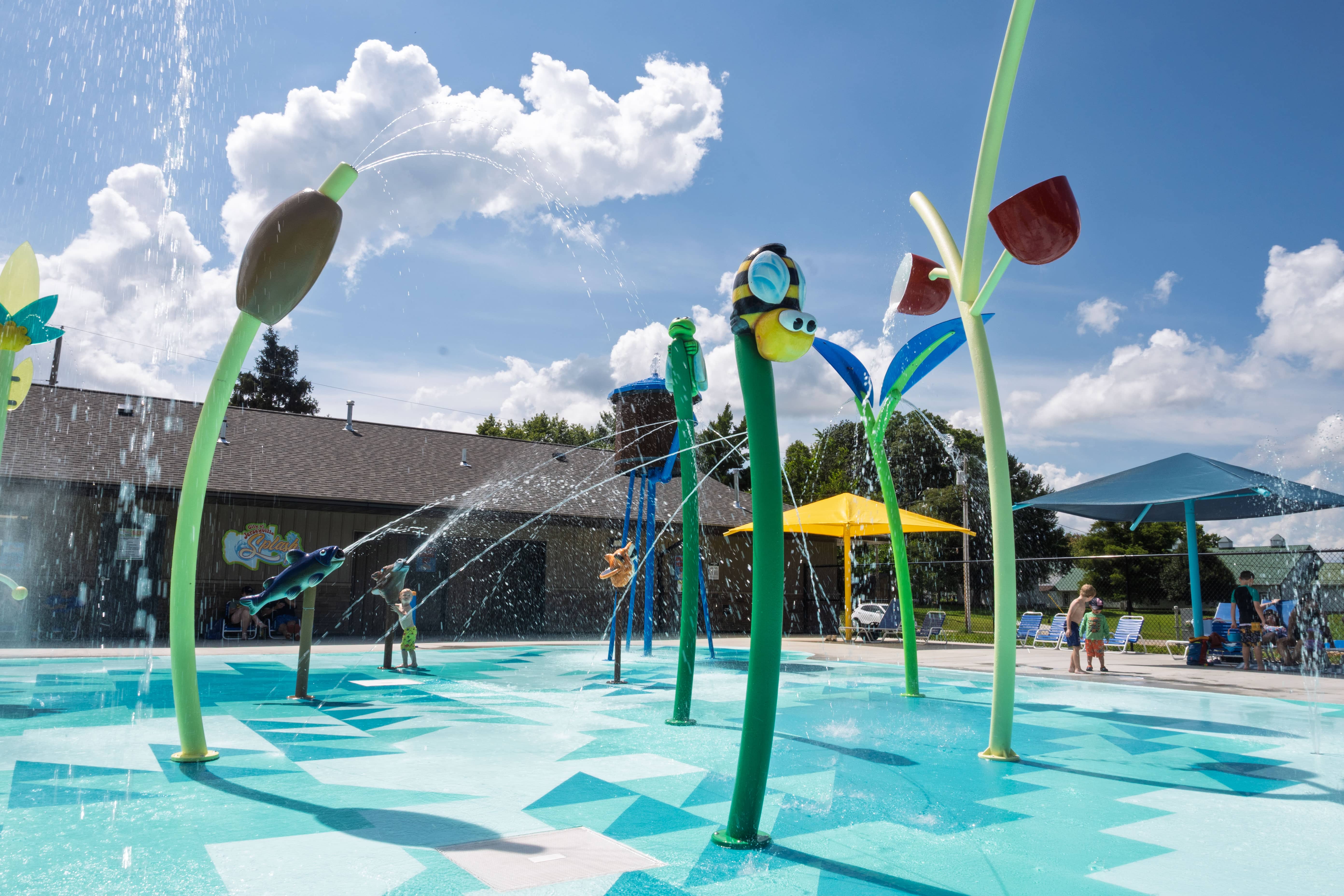The flooring design adds an additional touch of charm and place to the splash pad design. Interlocking tiles make up a county map-inspired flooring design, highlighting the county's pride in its rural roots. The splash pad operates on a flow-through manifold system, supported by a sequencing controller, which ensures efficient water distribution and adds playful spray sequences.