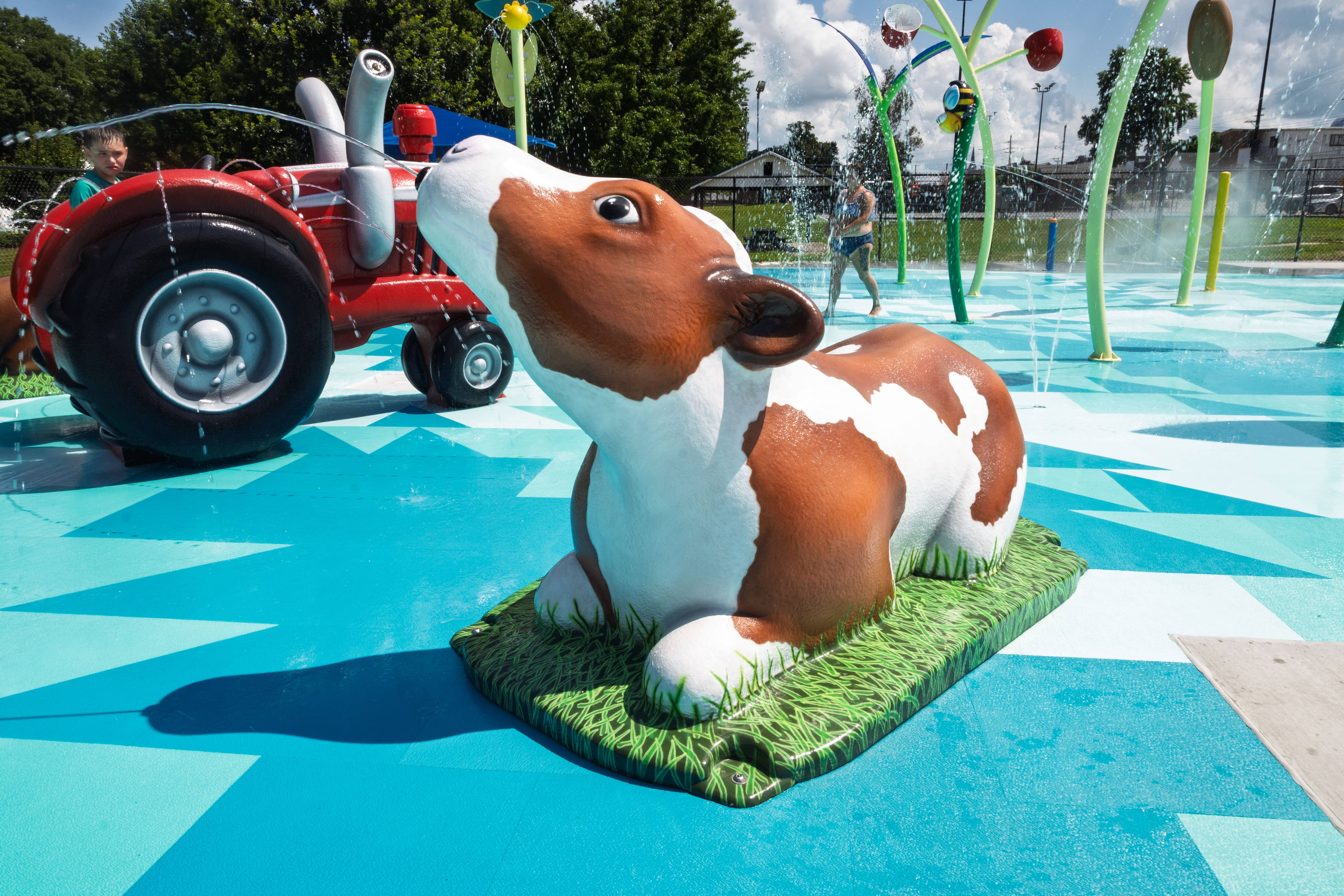 Themed aquatic play features reflect the town’s agricultural roots, inspiring imaginative aquatic play through colorful, farm-inspired spray park products. Patrons can “drive” Earl’s Tractor, splash alongside Bacon Bits the Pig, or cool off under the sprays of the Cow and Horse themed sprayers. These whimsical Fun Forms™ spray features instantly tie the design to the character of the region, making the splash pad feel uniquely local.