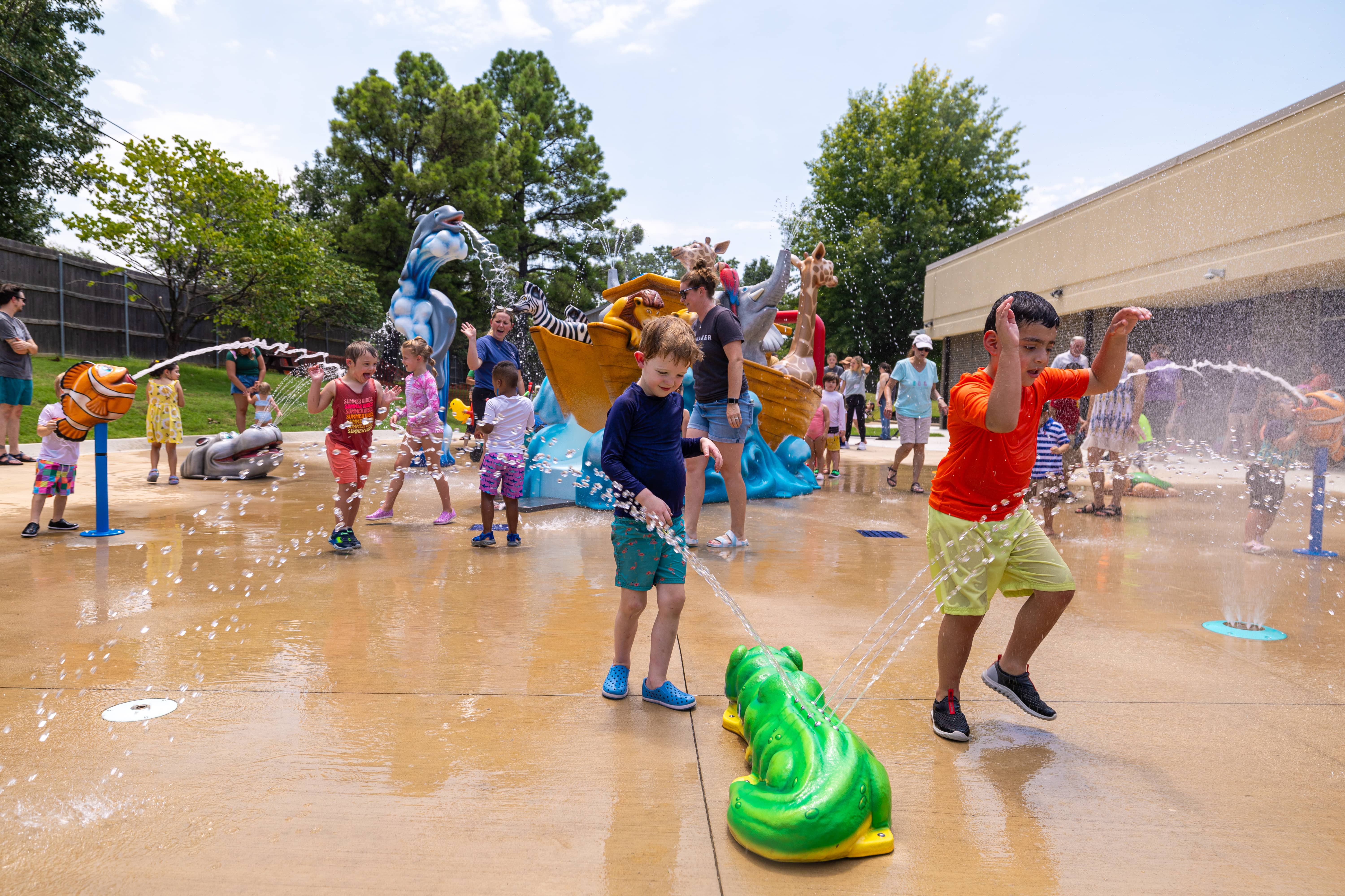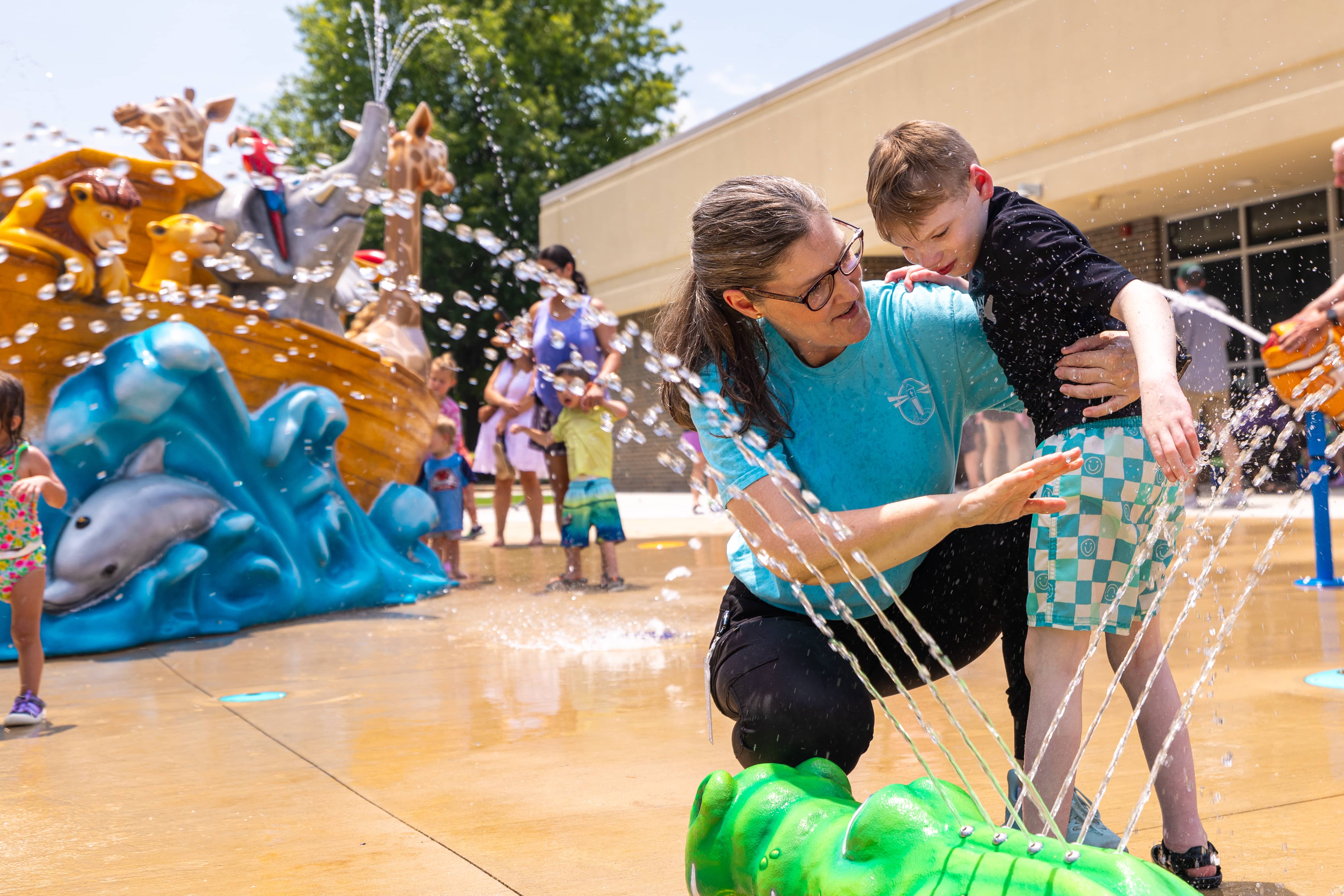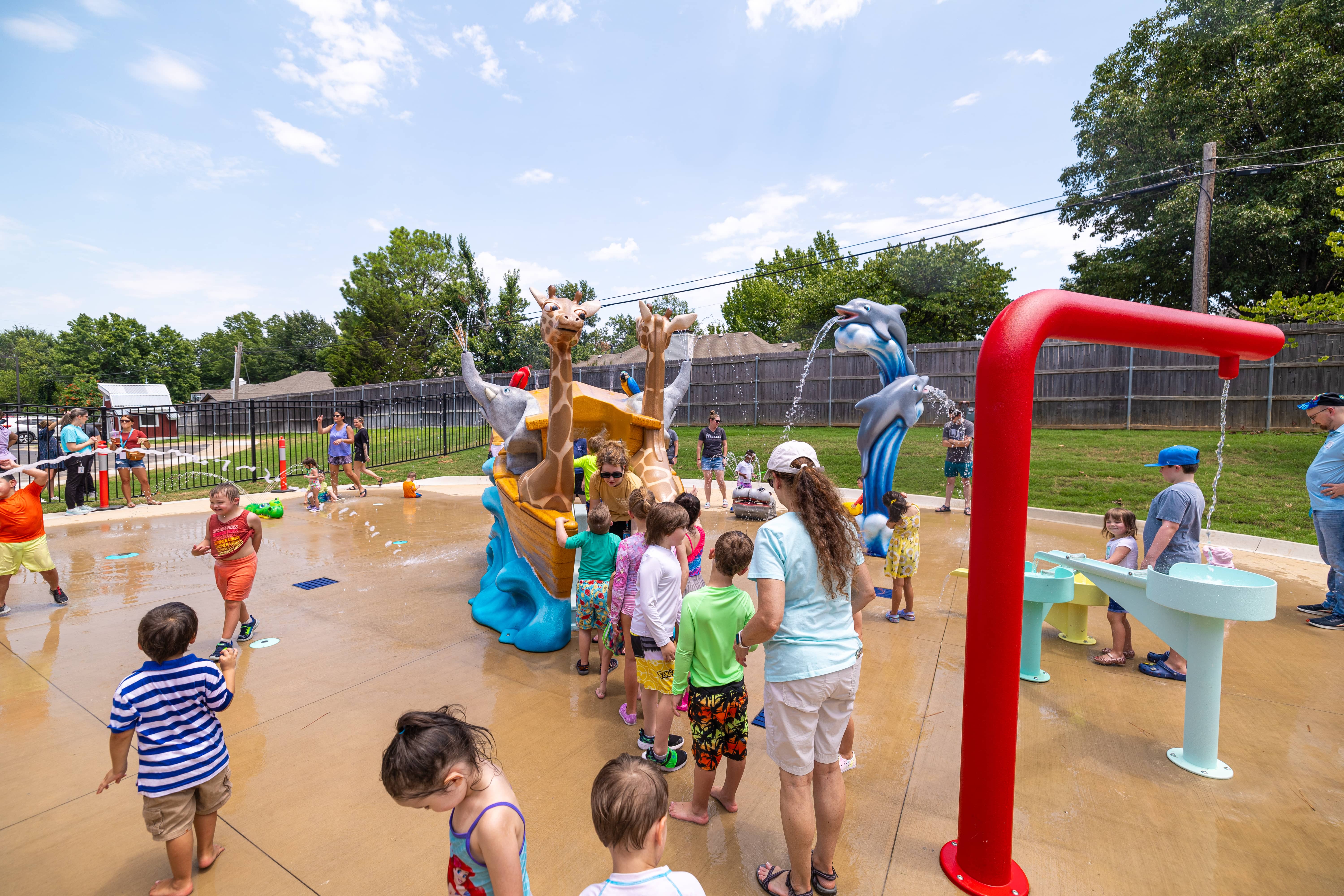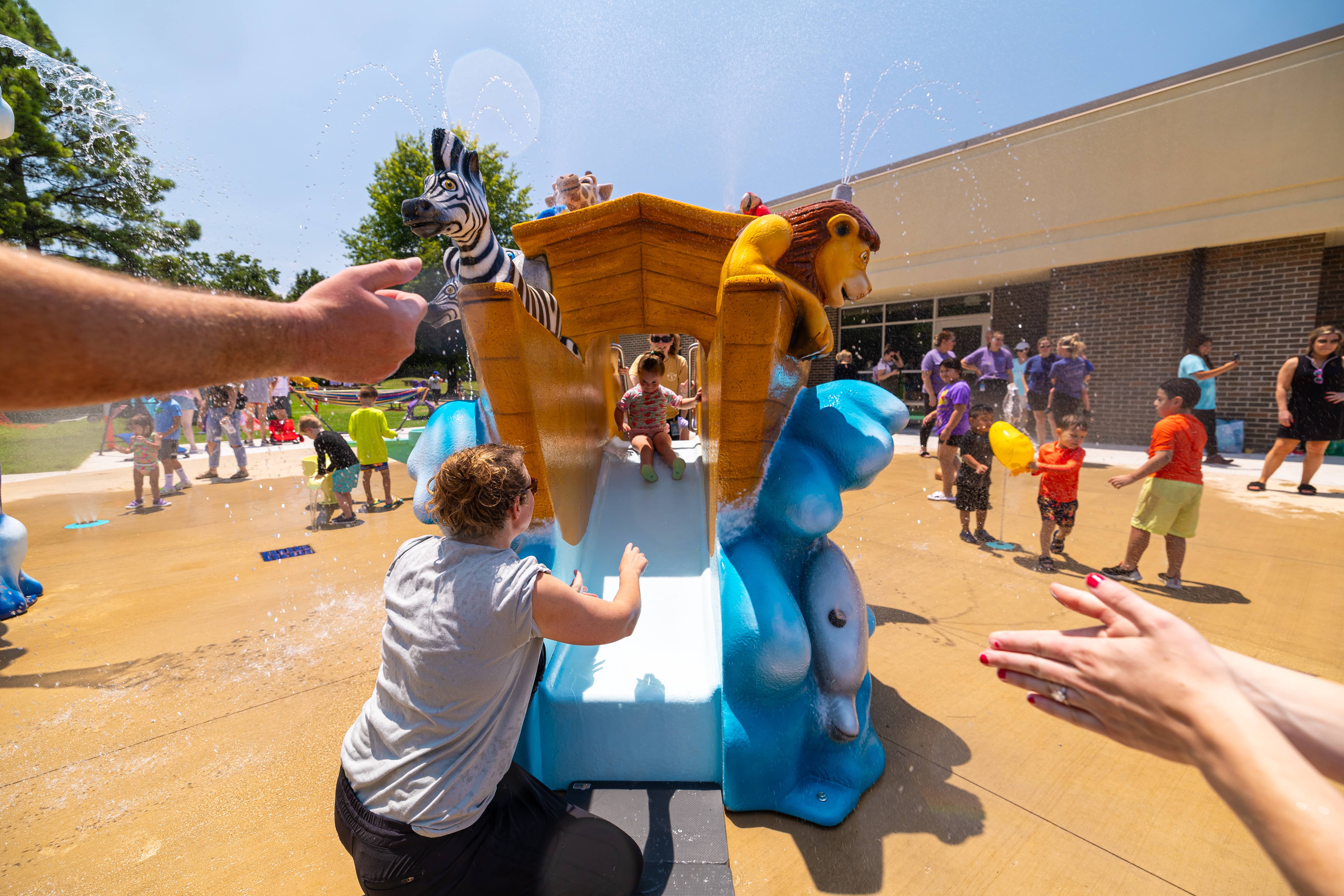 Spanning 2,179 square feet, the splash pad features an immersive Noah’s Ark theme, selected by staff as their favorite story from the curriculum. The splash pad blends essential and themed aquatic play elements to create a dynamic, multi-sensory environment that is both engaging and accessible. Themed play elements include a custom Noah’s Ark Aqua Slide, which serves as the centerpiece of the splash pad, bringing the biblical story to life. The water slide is designed to resemble a vibrant ship sailing across the seas, with a lively collection of spritely zoo animals aboard. Children can spot spraying zebras, giraffes, lions, elephants, and tropical birds perched along the boat, each rendered with playful expressions and bold colors to spark imagination and wonder.