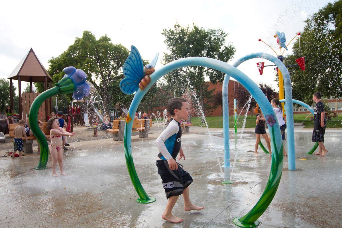 A butterfly sits atop this nature inspired Water Ring™ that creates a screen of water through which children can pass through.