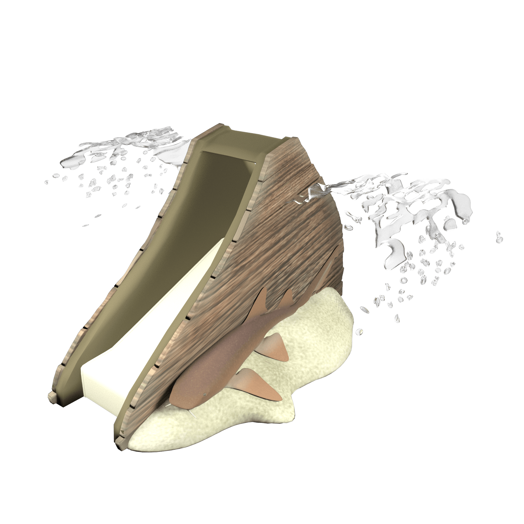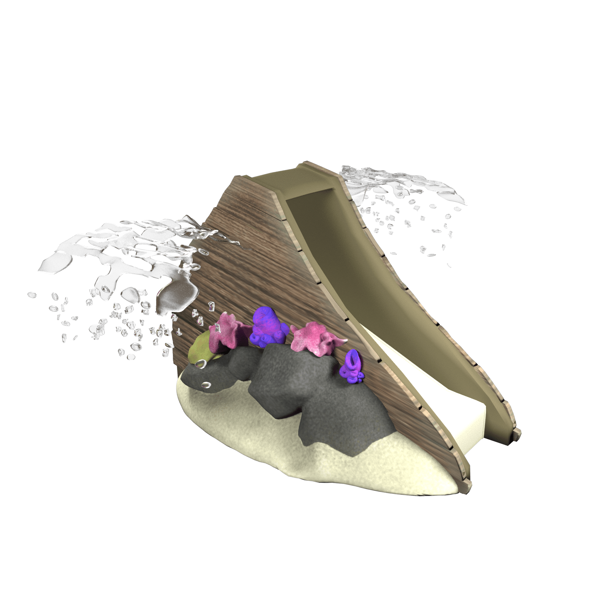 This Aqua Slide is designed with a straight chute and features a nurse shark and colorful coral. Optional water effects include arching fans of water on opposite sides of the slide for enhanced play value.