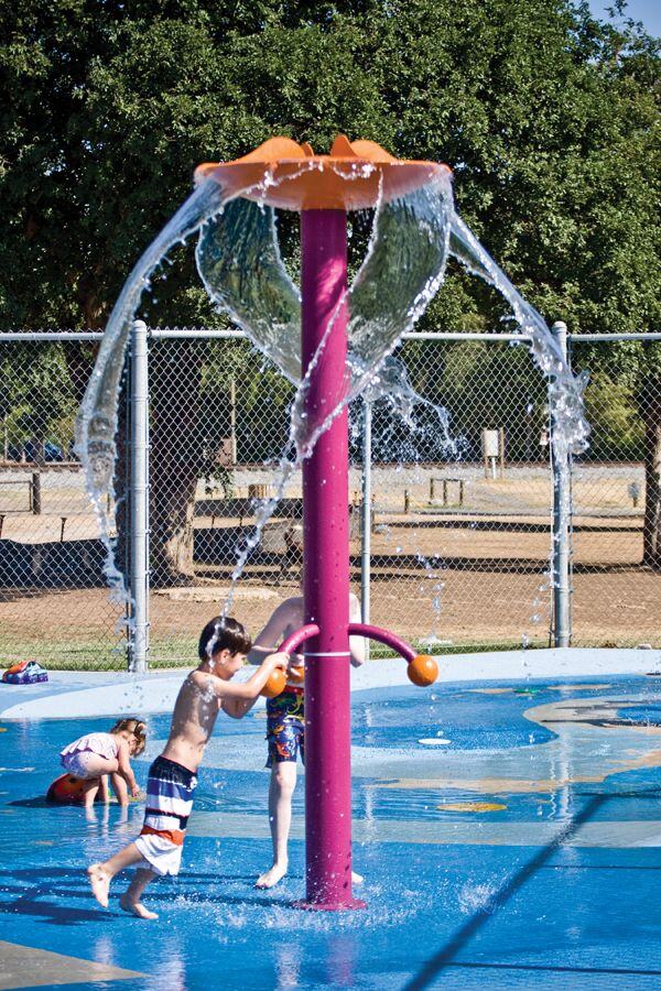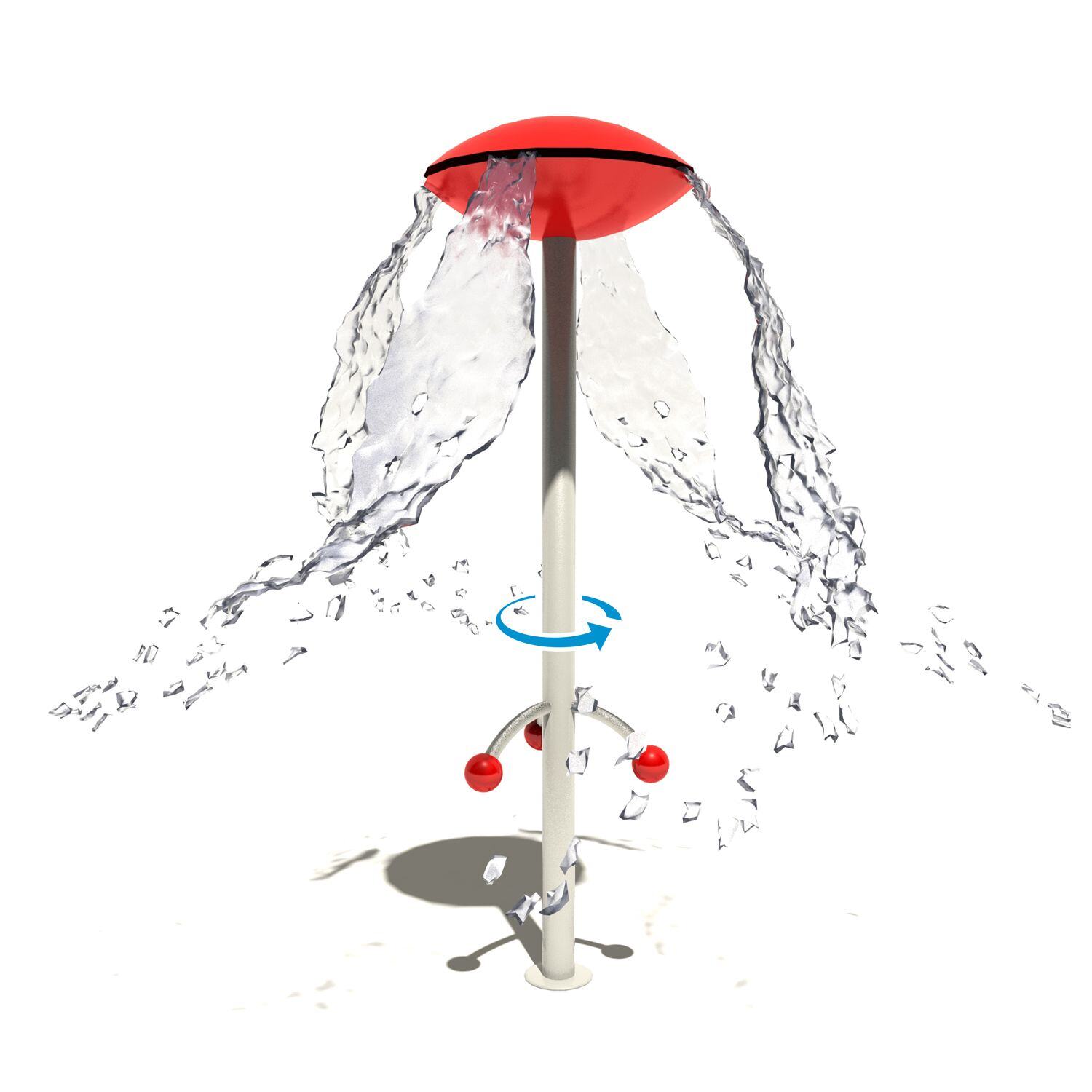 Children turn the handles of the unique Spin-Brella™ to cause sheets of water to swing and sway about the pole.
