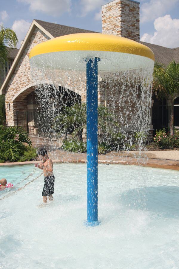 Water rolls over the top of the dome of the Under-Brella™ creating a playful circular waterfall. FRP dome is standard.